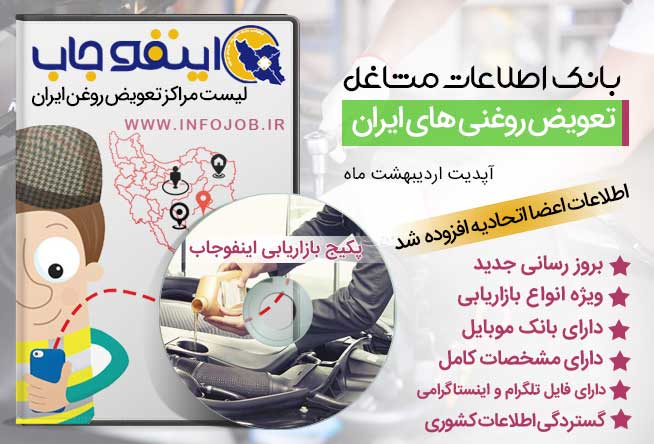 در این بانک اطلاعاتی لیست کاملی از فروشگاه های تعویض روغن و خدمات و اتوسرویس به صورت عمده فروشی یا مراکز خدماتی گرداوری شده است. این بانک اطلاعاتی شامل مشخصات کاملی از اطلاعات تماسی مدیران تعویض روغنی می باشد.